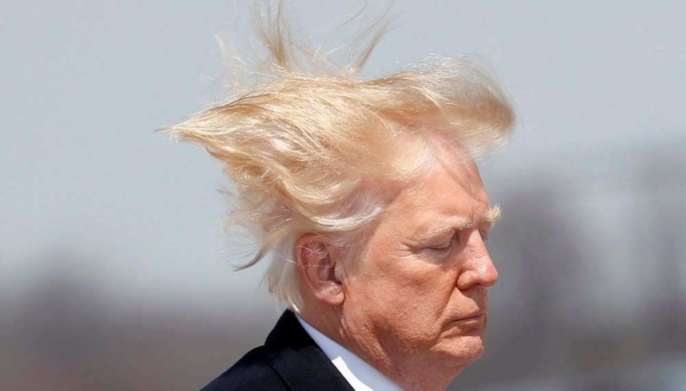 资料图:2018年4月5日,美国总统特朗普登上空军一号前往西弗吉尼亚州, 一头金发被吹乱。来源:视觉中国