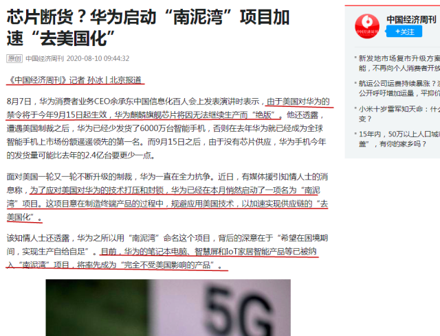 第二个重磅决定就是华为已经启动“南泥湾”项目,8月10日,来自中经周刊的报道,为了应对美国的技术打压和封锁,华为在本月已经启动了“南泥湾”项目,该项目的目标就是打造去美化的终端产品,比如首批实现去美化的终端就有笔记本电脑、智慧屏以及IOT物联网智能家居产品。