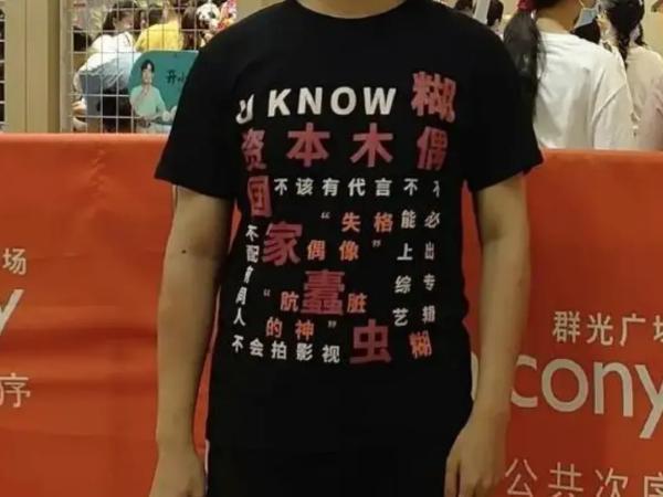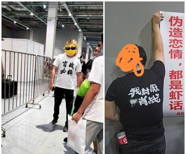 这种场合,也出现了有人穿着和“肖战必糊”类似的衣服,黑色T恤上面印着白色、红色的字,“资本木偶”、“国家蠢虫”、“不该有代言”、“不能上综艺”、“不会拍影视”等字句。