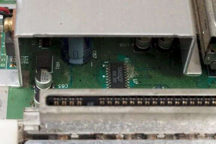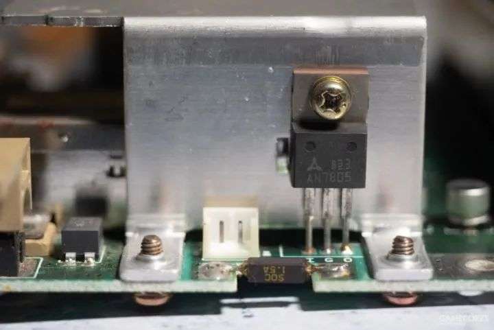 固定在这个铝上面的是一枚AN7805芯片,三端稳压,能把输入的电源变换成5V提供给主机。早期使用的是三极管设计,在转换效率上非常有限可能连80%都不到,很多耗散的能量变成了热量,所以必须要用这种巨大的铝来散热。