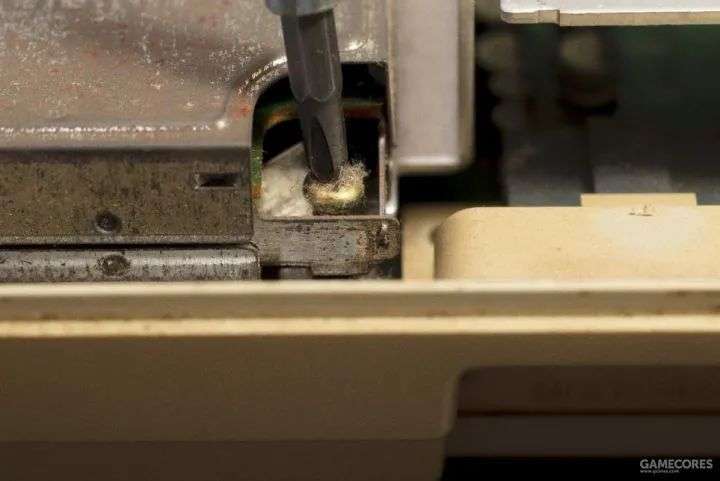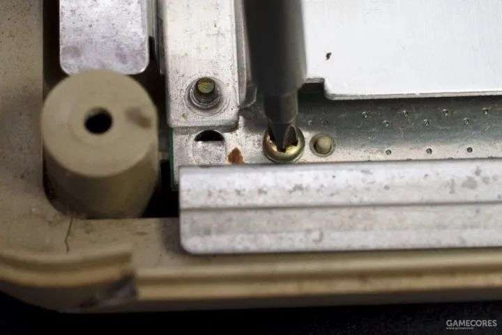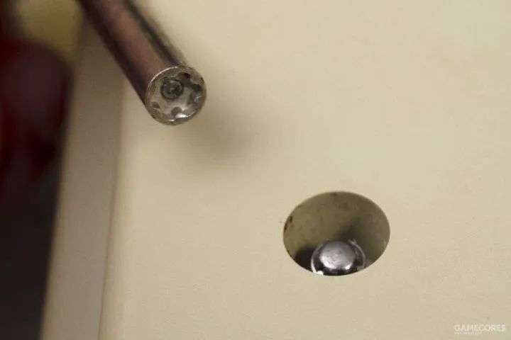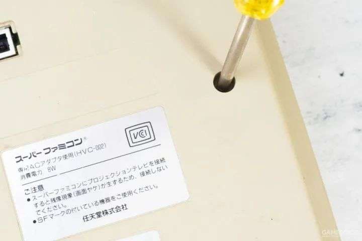 想拆开SFC需要用特制的螺丝刀,这种口在普通的多合一套装是没有的,所以这台游戏机也免去了被拆的风险。因为我发现有一个螺丝被拧出来过但没有完全拧出。