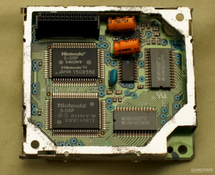 这一个模块的芯片面是这样的,内置的芯片两片居然都是和索尼合作的,一片是SMP(Sound & Music Processor)另一片是DSP(Digital Signal Processor)。然后在图片右侧还有两块摩托罗拉的存储器型号为MCM51L832F12,是32KB容量的SRAM。