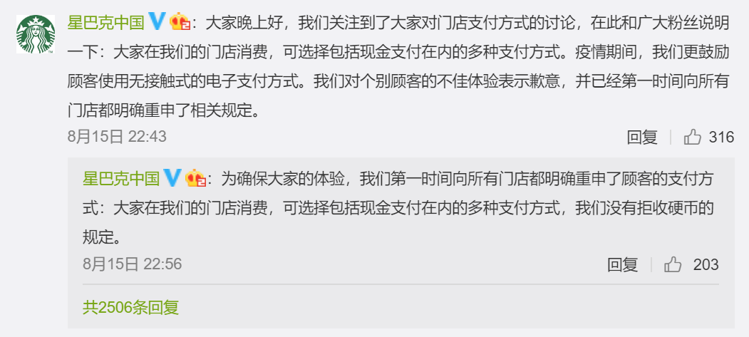 对于网友的质疑,8月15日晚,星巴克中国官方微博在评论区作出回应称:“我们关注到了大家对门店支付方式的讨论,在此和广大粉丝说明一下:大家在我们的门店消费,可选择包括现金支付在内的多种支付方式。疫情期间,我们更鼓励顾客使用无接触式的电子支付方式。我们对个别顾客的不佳体验表示歉意,并已经第一时间向所有门店都明确重申了相关规定。”