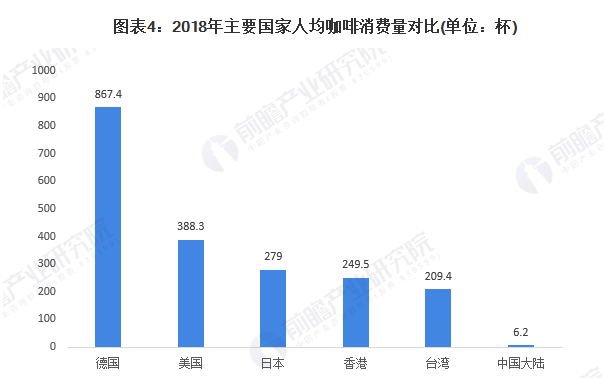 Frost&Sullivan数据显示,2018年中国人均咖啡消费量6.2杯,中国人均咖啡消费量与发达国家相比依然处于较低水平,2018年中国大陆地区咖啡人均消费量仅为德国的0.71%,美国的1.6%,中国咖啡市场空间还有巨大潜力待挖掘。