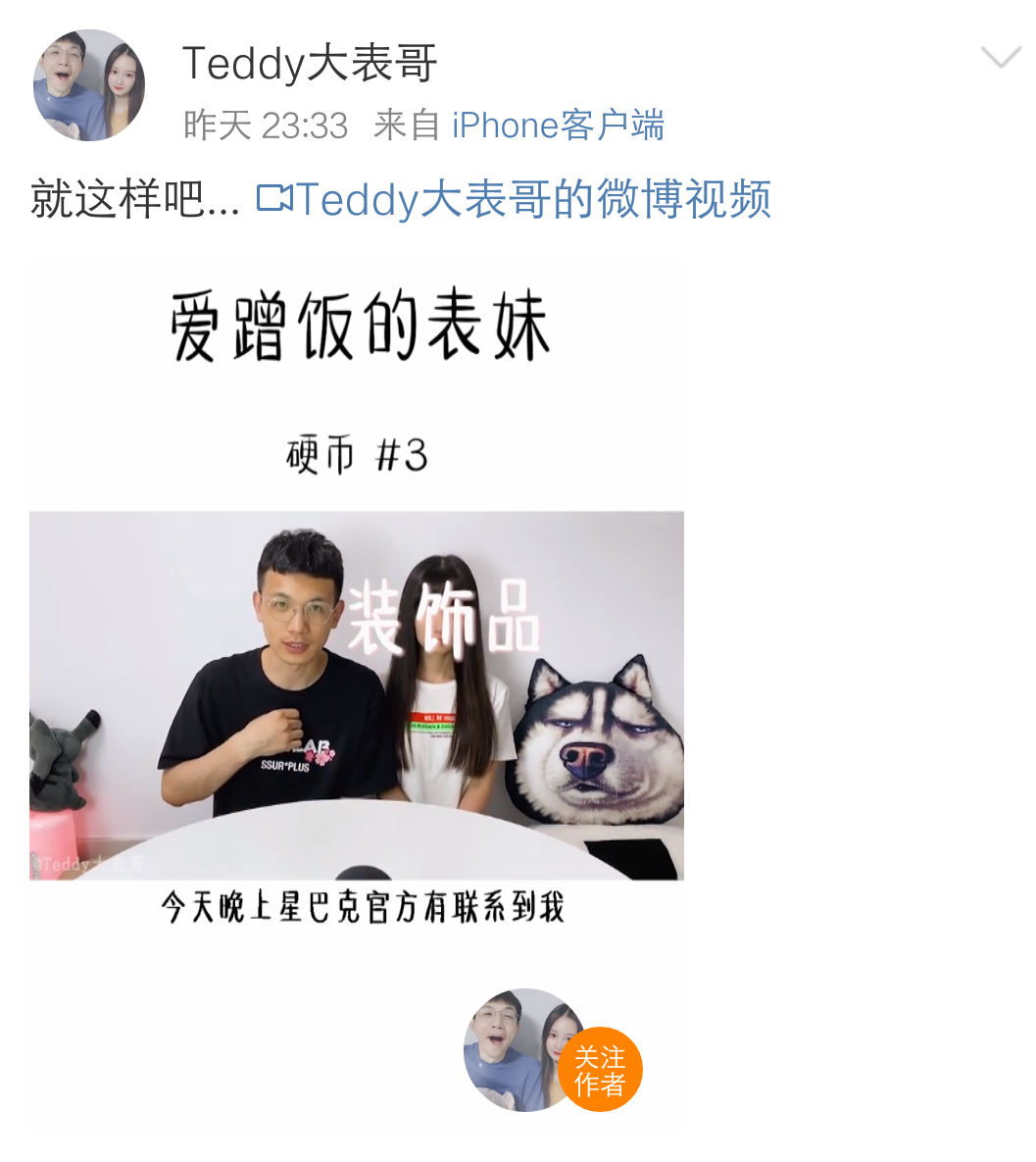 8月16日晚,"Teddy大表哥"发布名为《星巴克后续》的视频称,"拍摄那期视频的本意和其他挑战类视频是一样的,没有想故意为难谁。使用硬币支付,实际上其他商家都很愉快的接受了,但整体上也有考虑不周,给这些商家带来了一些不必要的小麻烦。"