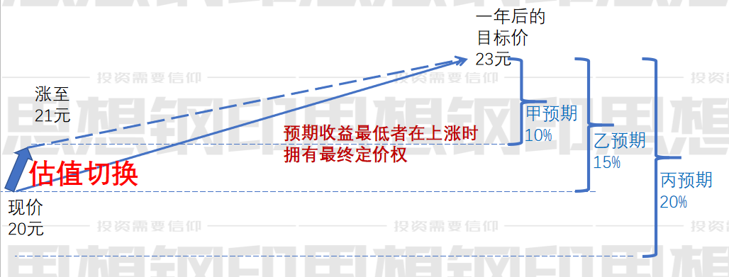 接下来,甲乙的买盘将股价推升至20.5元,此时的预期收益降至12%,已经低于乙的预期收益要求,高于甲。于是,乙停止买入,甲继续买,一直买到21元,预期收益低于10%,甲也停止。
