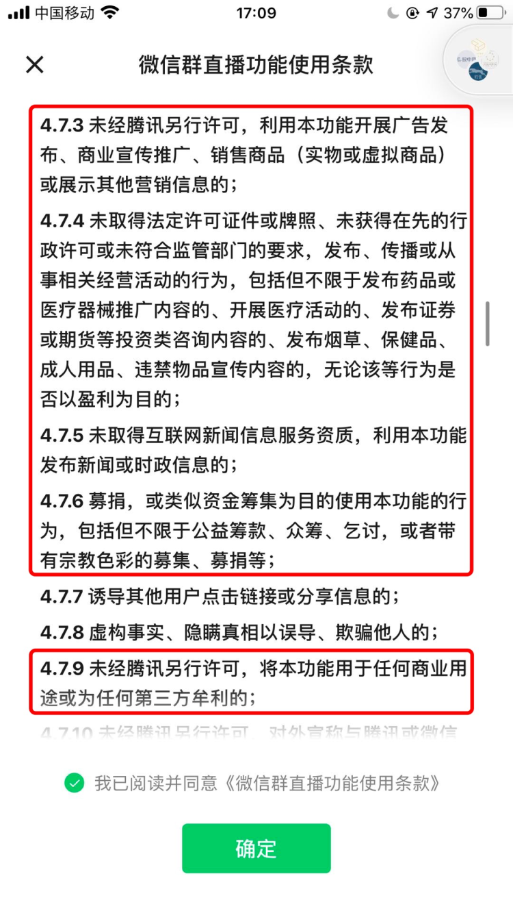 “微信群直播功能使用条款”一共有8个大点,数十个小点,需要在开始直播前勾选同意。
