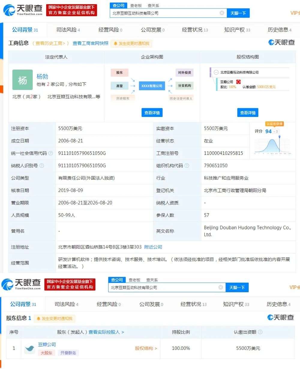 记者查询发现,豆瓣的主体公司为北京豆瓣互动科技有限公司,阿北为公司法人,该公司成立于2006年8月,注册资本5500万美元,唯一股东是一家注册在开曼群岛的境外公司。