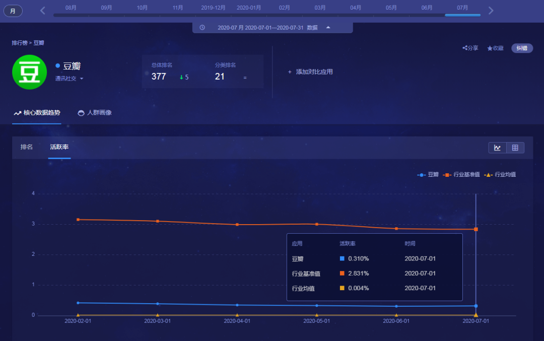 TalkingData数据显示,截止到今年上半年,豆瓣在全网应用中排名377,通讯社交内排名21,用户活跃率0.41%,远低于3.15%的社交行业基准值。