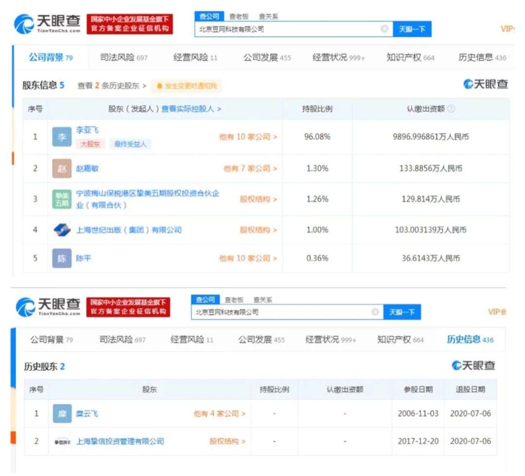 公开资料显示,豆网科技现大股东李亚飞早在2017年就已成为豆网科技的法定代表人,并担任经理一职。加入豆瓣之前,李亚飞曾任最高人民法院政治部法官管理部部长、2019年全票担任豆瓣党支部书记。