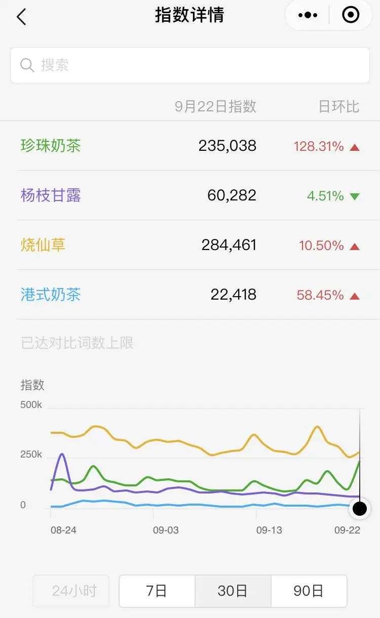 近一个月来全国陆续入秋,我们以9月22日为节点,选取了30天的数据,横向对比了珍珠奶茶、杨枝甘露、烧仙草、港式奶茶的微信指数: