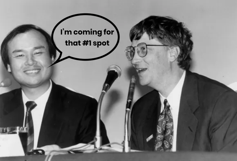 早在2000年的时候,在互联网泡沫的推动下,孙正义曾短暂地当上了世界首富。他曾这么告诉Charlie Rose:“有那么3天,我比比尔·盖茨还要有钱。在那三天内,我们的市值达到了2000亿美元。”