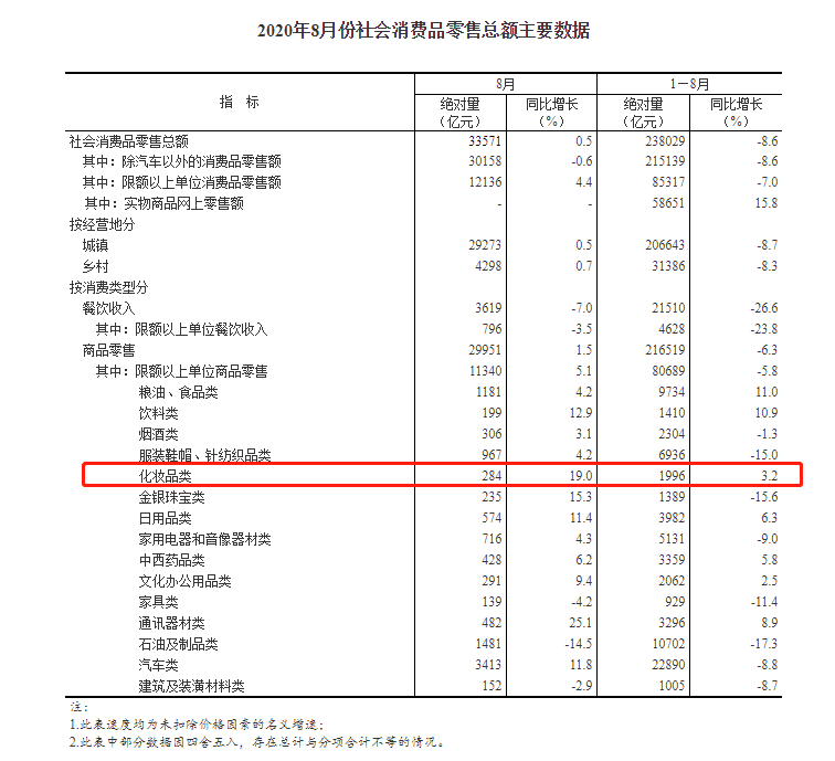 即便是在所有人都不出门的疫情期间,美妆品类的表现也格外突出。国家统计局发布的最新社会消费品零售数据显示,1-8月份,化妆品牌行业表现极为突出,零售总额达1996亿元,同比增长3.2 %。