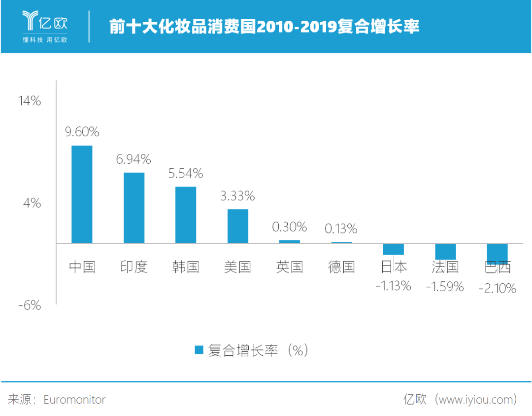 全球视角来看,前十大化妆品消费国中,中国、印度、韩国等新兴市场在过去十年增长明显。其中根据Euromonitor统计,中国在2010-2019年中以9.6%的复合增速领跑全球。