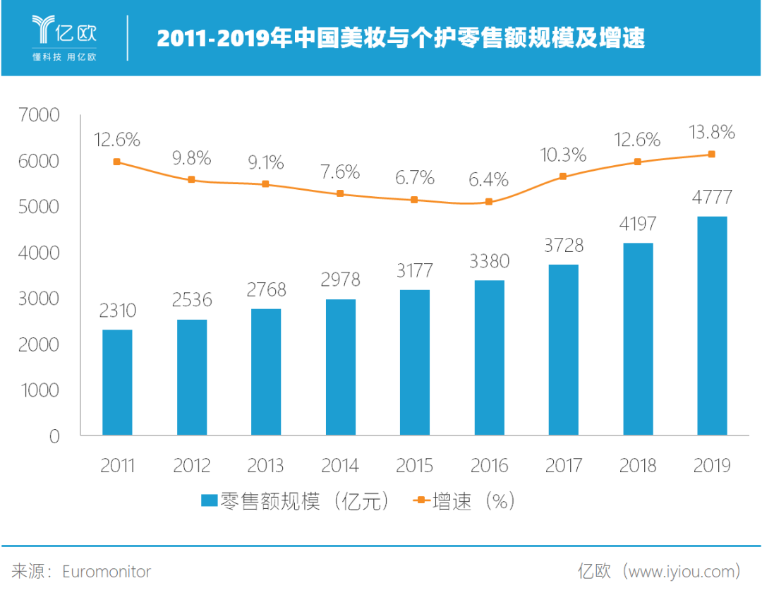 受益于消费人口与消费额扩容,化妆品行业处于中高速成长期。自2017年起加速成长,2019年美妆个护市场规模达到4777亿元,同比增长13.8%。