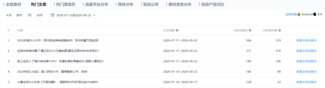 根据热云数据显示,《万国觉醒》目前投放的热门文案中,前五的文案有三条与”海外成绩“有关,两条与”战术策略“有关。竞核认为,这或许是莉莉丝通过调研后发现对于国内玩家最具吸引力的要素点。