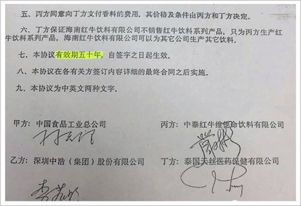 当时,严彬和许书标签订的协议是,在50年经营期限内,严彬负责生产销售,而许书标通过向红牛中国销售原材料、提供工艺配方获取利润,确保50年内中国红牛是大陆独家。