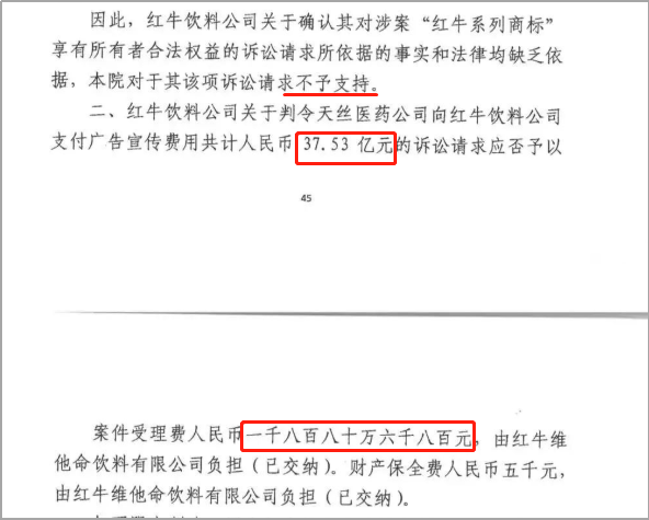 期间,中国红牛诉请确认红牛系列商标为其单独所有,或与泰国红牛共有,要求泰国红牛承担广告宣传费37.53亿元。