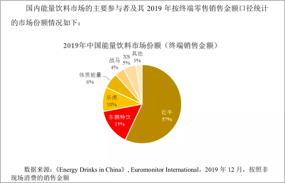 《Energy Drinks in China》数据显示,2019年中国能量饮料市场中,红牛依旧以57%的份额独占鳌头,接近第二名的4倍。