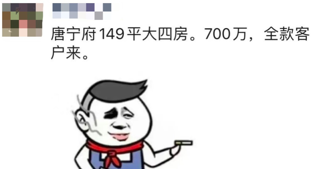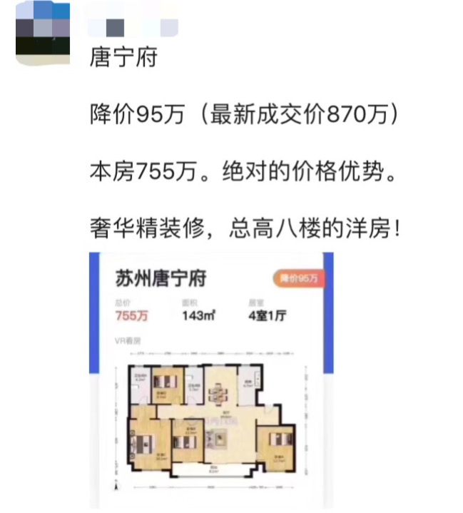 一套140多平的4房,从过去的将近900万一直到870万,再到755万,最近700万都有人要卖了。