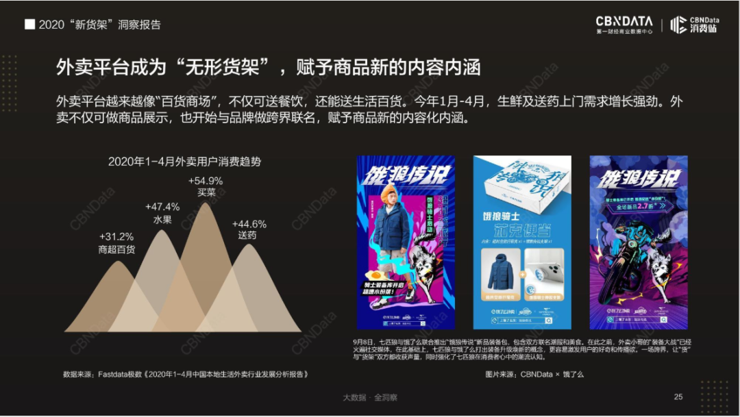 外卖平台不再只是送餐平台,它越来越多地承载了内容内涵。以饿了么和七匹狼的合作为例。在这次合作之前发生了一件刷屏的热点事件,就是外卖小哥的头盔竞赛。饿了么借此热点推出外卖小哥装备升级的概念,更容易激发用户的好奇和传播欲。另一方面,在活动期间,消费者可在饿了么平台上下单购买七匹狼服饰,拓展了服饰的购买场景。