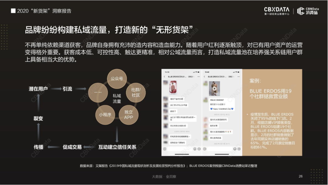 今年有很多消费品牌利用私域流量获得增长。鄂尔多斯旗的年轻品牌BLUE ERDOS,因为疫情原因在2月份暂时关闭了95%的门店。为了自救,BLUE ERDOS组建了19个社群,2月份的营业额做到了去年同期门店的65%。一个客单价上千元的羊绒品牌,靠社群引流,培养了一群忠诚用户。