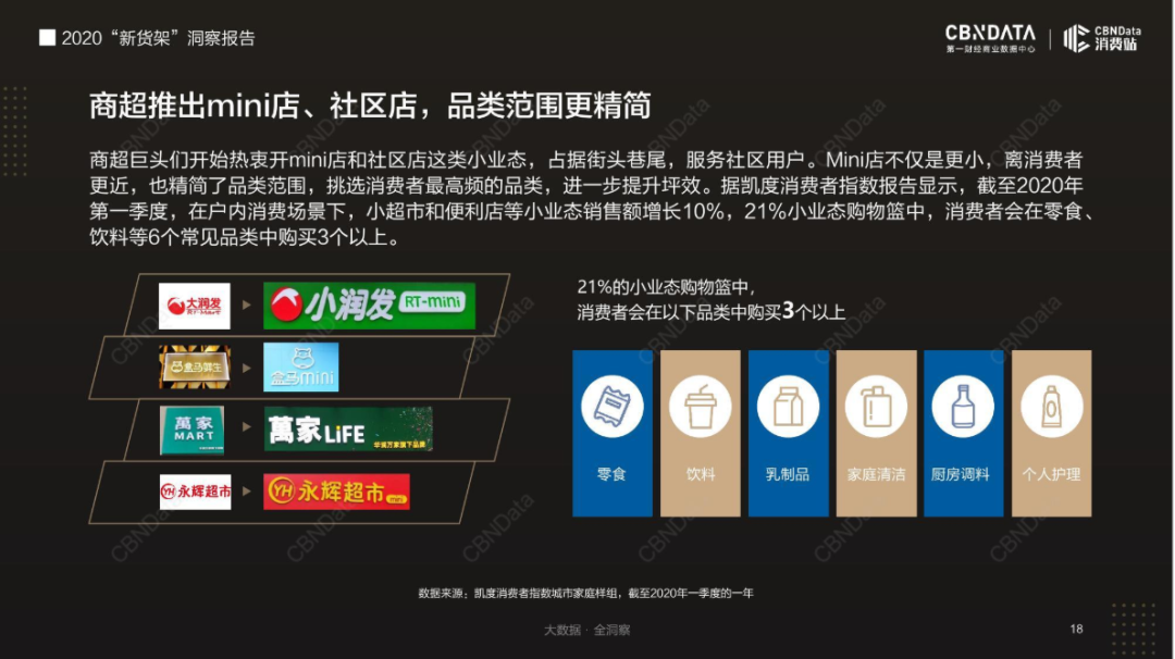 第三个“新货架”趋势是大商超开始在社区开mini店。比较典型的例子是,大润发开出了小润发,盒马也推出了“盒马mini”。这些门店不仅是在面积上缩小了,在SKU上也做了精简,挑选消费者最常购买的商品品类,一定程度上也是希望消费者更多地走进门店消费。距离更近、品类更集中,也进一步提升了坪效。