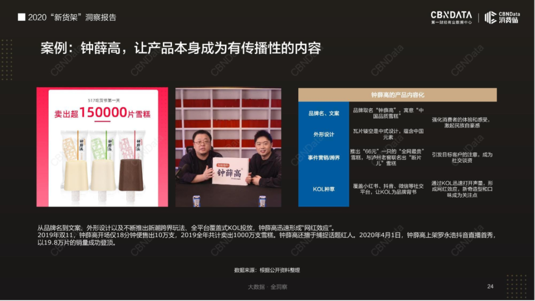 以钟薛高为例。钟薛高在品牌名称上就花了些心思,“钟薛高”寓意“中国的雪糕”,打造的其实是国潮概念。在外观设计上,钟薛高也是紧扣国潮主题,采用瓦片造型。另外,钟薛高策划了一个“全网最贵雪糕”的事件营销,一定程度上吸引了越来越多吃瓜群众的关注。
