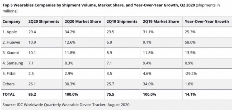 根据市场调研公司IDC发布的数据显示,2020年第二季度可穿戴设备的市场整体规模同比提升了14.1%,不过,Fitbit的市场份额却从2019年的4.6%下降到了2.9%,出货量降幅达到了29.2%。