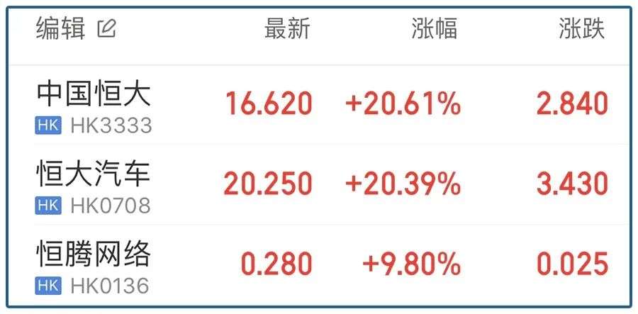 截至9月28日收盘,中国恒大(3333.HK)大涨21%,报收16.62港元;恒大汽车(0708.HK)大涨20%,报收20.25港元;恒腾网络(0136.HK)大涨10%,报收0.28港元