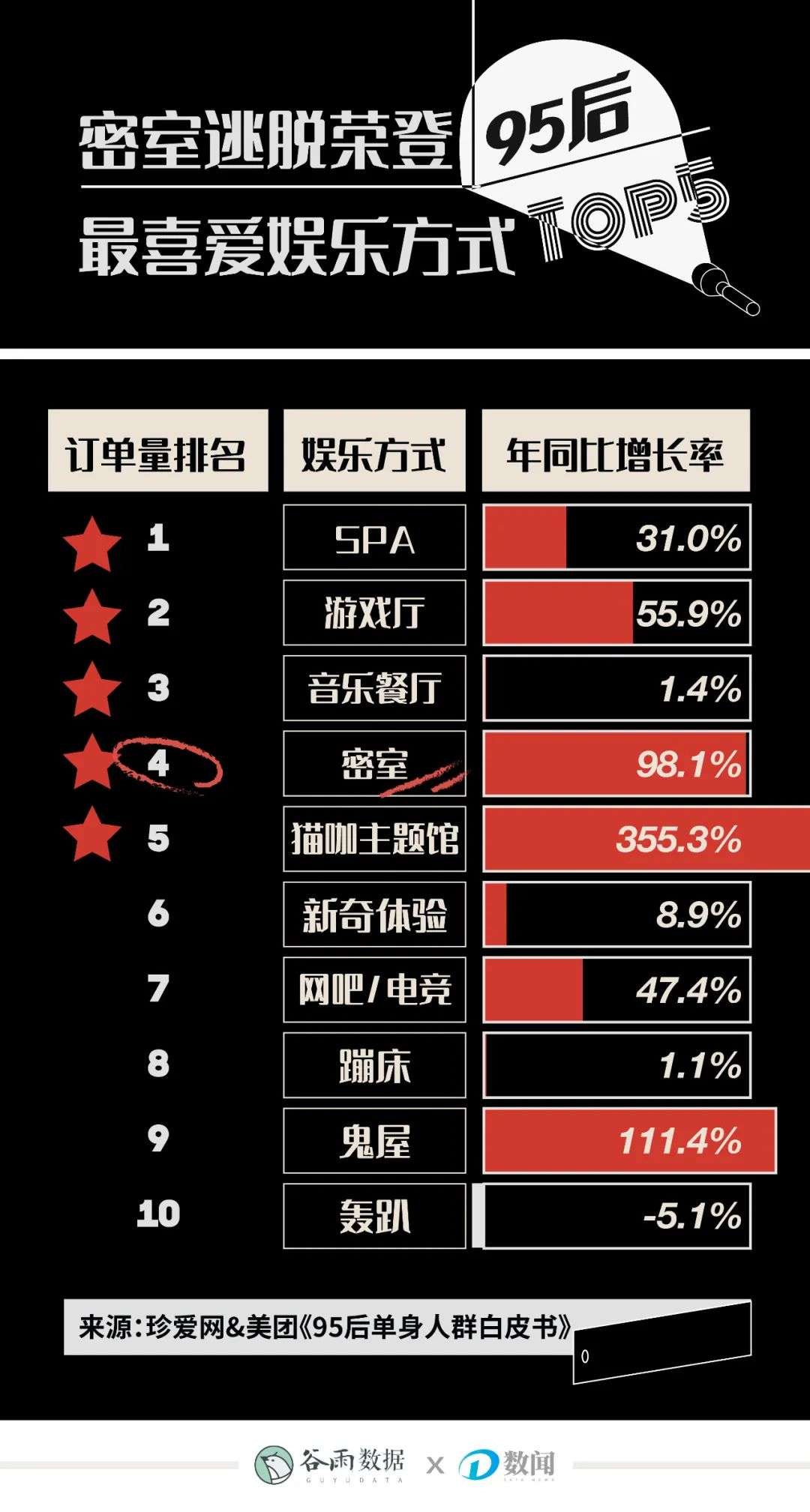 珍爱网&美团在8月底联合发布的《95后单身人群白皮书》中提到,95后最喜爱的新兴娱乐方式中,密室排名第四,订单量的年同比增长率达到98.1%。
