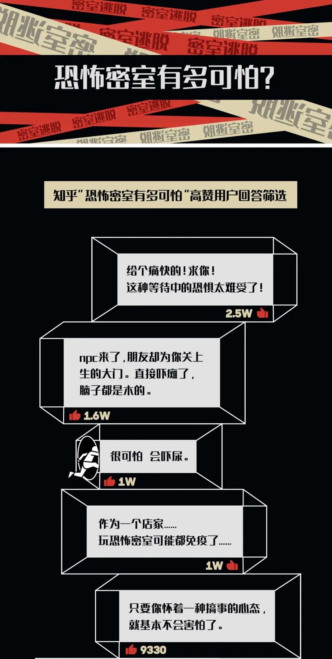 知乎平台上,针对"恐怖型的真人密室逃脱有多可怕?",2700多名网友说出了自己的亲身经历。核心观点离不开"怕",但具体被吓到的过程,更像是一千个密室玩家心中,有一千个哈姆雷特。
