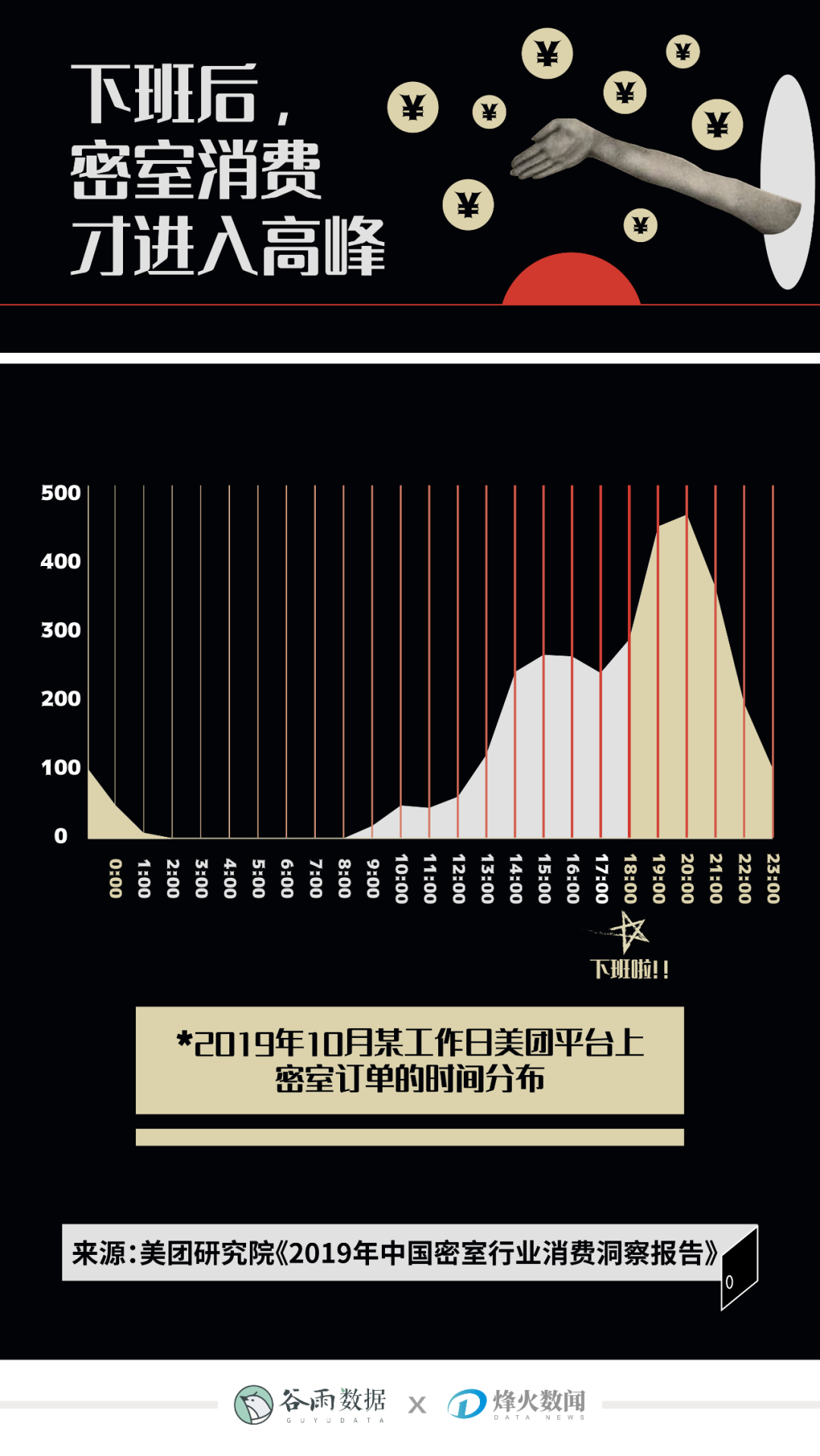 美团研究院随机抽取了2019年10月某工作日的密室逃脱订单情况,发现密室消费高峰时段出现在晚上7点后,甚至有玩家专门选择凌晨场次,可谓"熬最深的夜,碰最辣的鬼"。