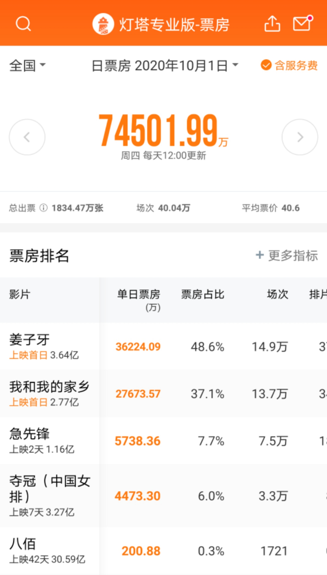 2020年10月1日票房(图片来源:灯塔专业版)