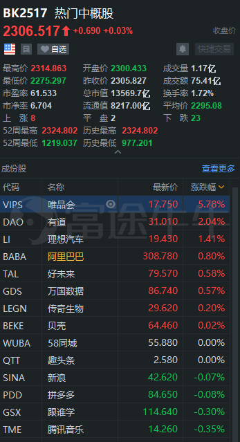 热门中概股中,阿里巴巴上涨0.80%,拼多多下跌0.08%,京东下跌2.03%,网易有道上涨2.04%,网易下跌0.69%,蔚来下跌1.05%,虎牙跌2.49%,斗鱼跌超1.85%,