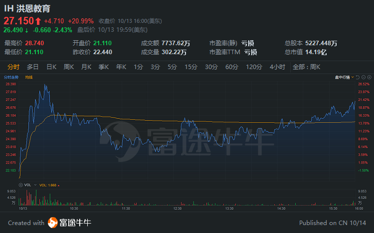 上周五登陆美股市场的洪恩教育延续升势,再创新高,三日累涨125%。