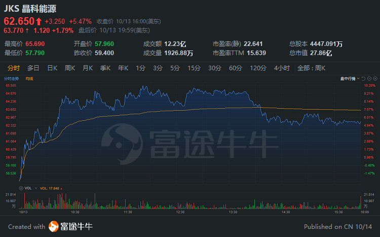 晶科能源盘中涨10%,再创新高,10月以来累涨60%。晶科能源是全球为数不多的拥有垂直一体化产业链的光伏制造商,业务涵盖了优质的硅锭,硅片,电池片生产以及高效单多晶光伏组件制造。