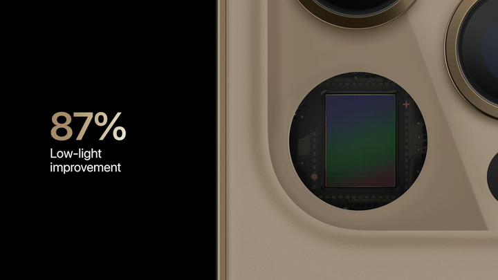 iPhone 12 Pro 的提升主要靠计算摄影拓展到全摄像头上,iPhone 12 Pro Max 则在主摄上则采用了新的感光元件,感光面积增长了 47%,单个像素达到了 1.7um,暗光拍摄能力提升了 87%。这颗主摄还支持传感器位移防抖技术,每秒能够进行五千次调整,手持下即便是 2 秒钟长曝光也能够稳定出片。