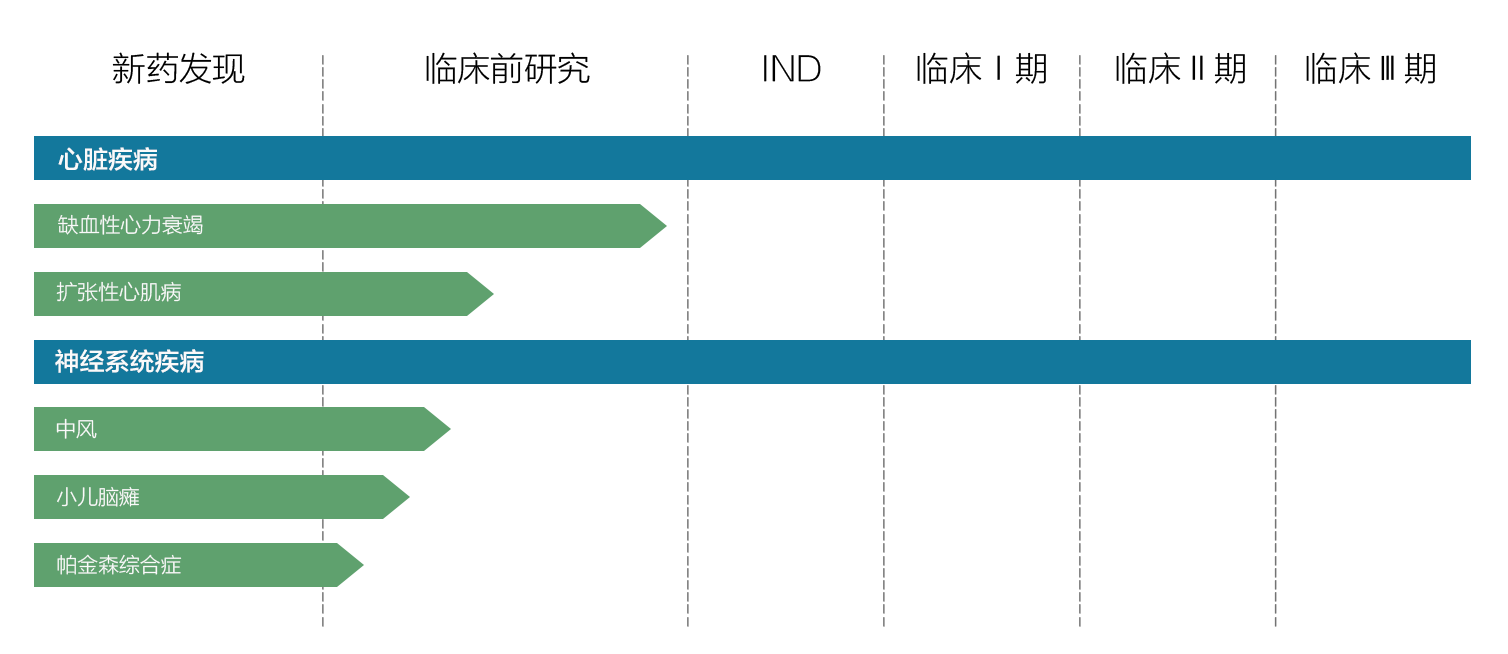 「艾尔普」目前的产品管线主要包括心血管领域和神经领域。在心血管领域,研究管线基于再生心肌细胞治疗,包括缺血性心力衰竭和扩张性心肌病。目前心血管领域管线已完成早期研究和临床前概念验证,处于IND申报阶段。在神经系统疾病领域,「艾尔普」目前主要关注中风,小儿脑瘫和帕金森综合症这三种疾病。