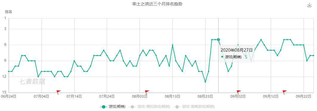 尽管SLG市场的竞争一向残酷且激烈,但上线至今已经5年的《率土之滨》身上似乎还看不出一丝的疲态,甚至还呈现出一种“逆生长”的趋势。从榜单排名来看,游戏目前的营收表现仍然十分出色,在过去的3个月时间里,游戏大部分时间都稳守在国内畅销榜TOP10以内,甚至一度冲上了畅销榜TOP5。