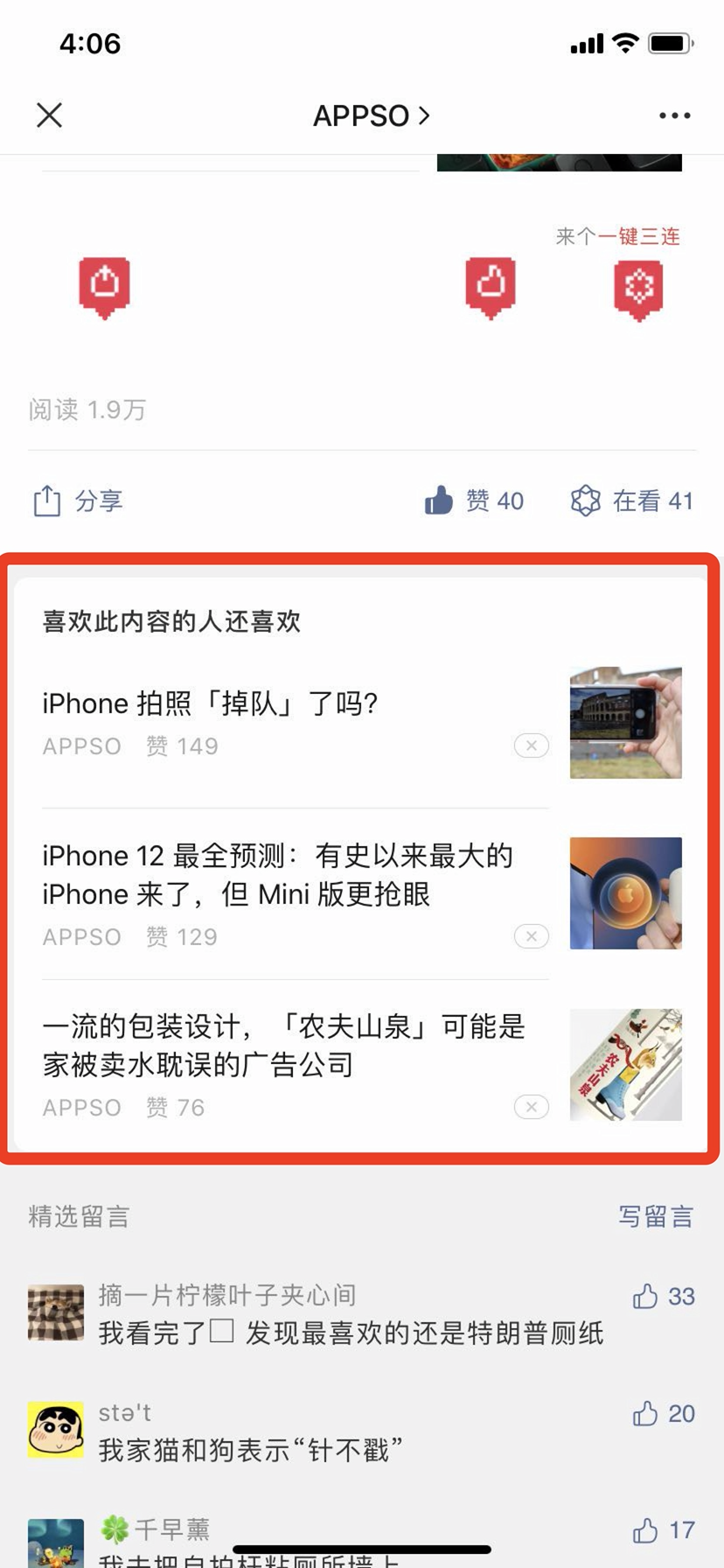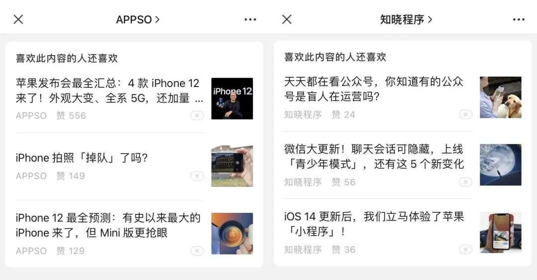 用户在对文章表达「点赞、在看、分享」等喜欢的互动动作后,将可以看到留言区顶部新增的「喜欢此内容的人还喜欢」版块,该版块将显示喜欢同一篇文章的其它用户喜欢的内容,包括公众号名称、文章标题、封面、点赞数,帮助用户进行延伸阅读。