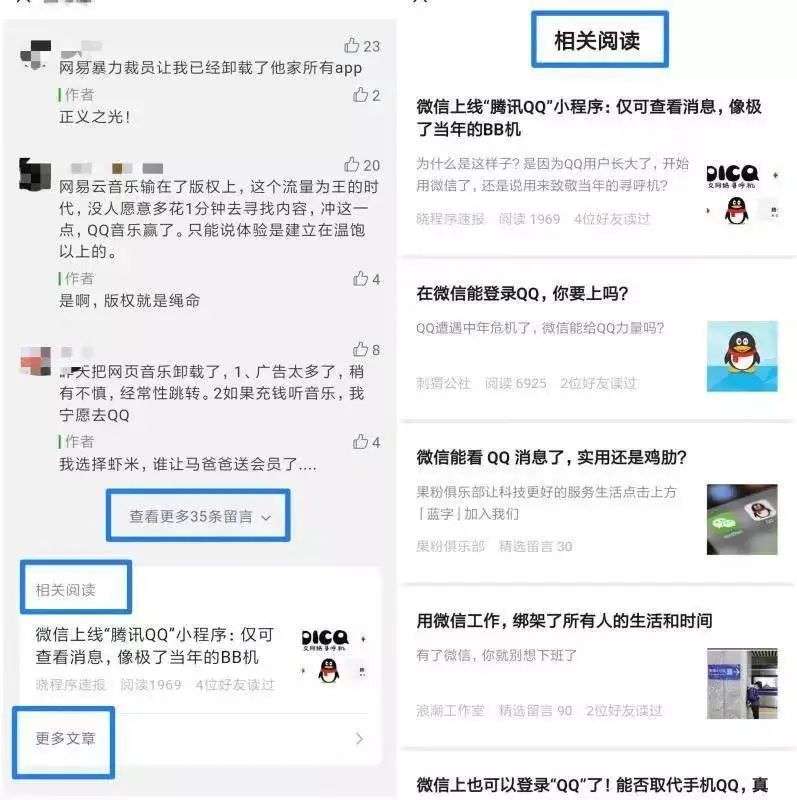 这个功能的前身「相关阅读」原先在折叠后的留言区下方,通过「相关阅读」的贴片模块给读者推荐相关文章,留言区底部会显示文章标题、封面、阅读量以及来源公众号,读者点击即可跳转进行阅读。