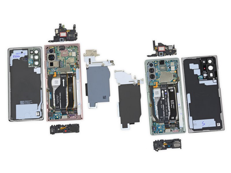 在之前的介绍文章中: sspai.com/s/K1G8 ,当时其实已经有一个 5G 频段导致手机内部设计「分化」的典型案例:根据 iFixit 与 JerryRigEverything 对 Galaxy Note 20 系列的拆解发现,三星为不同版本的 Galaxy Note 20 Ultra 设计了两套不同的散热结构:分别是和之前 Galaxy 系列旗舰手机类似的铜蒸气室散热结构,以及另一个采用了石墨烯散热结构的新版本。 这样的散热差异就是为了容纳不同频段的 5G 天线与射频模组做出的设计调整。
