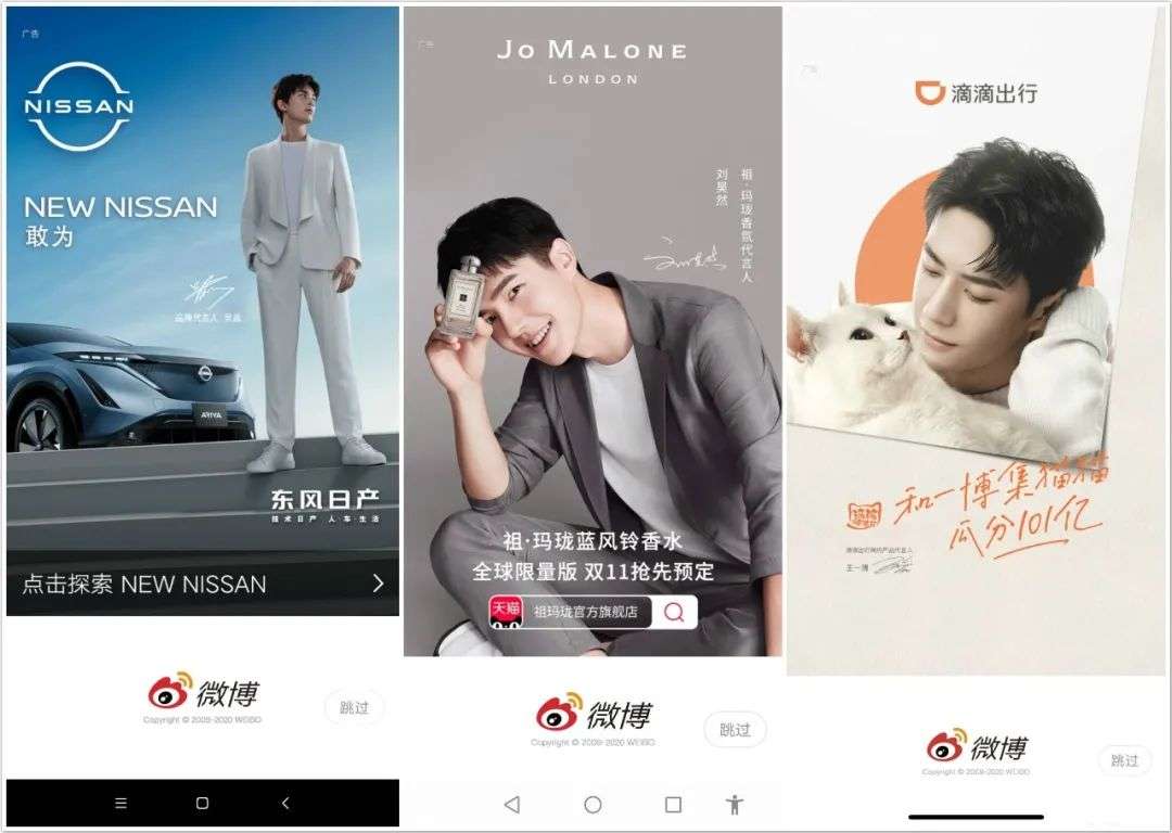 随手打开微博,开屏广告几乎成为了滚动的流量男明星代言看板:上午是站在豪车旁边的吴磊弟弟,下午是闻着香水的刘昊然,晚上是向你推荐打车软件的王一博……