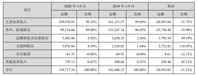 华谊兄弟今年1-9月公司营业收入11.07亿元,同比减少31.51%;归属于上市公司股东的净利润为亏损3.26亿元。