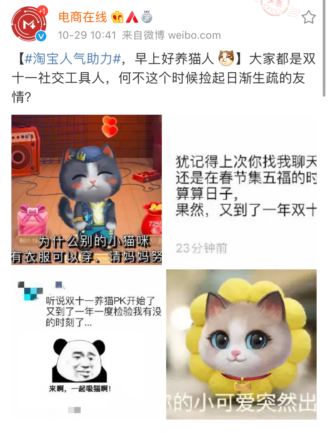 在微博上,#淘宝人气助力#冲上了热搜,累计阅读过亿,网友们为了自己的“猫孩子”拉人助力人气,“养猫”成今年双11的新热词。