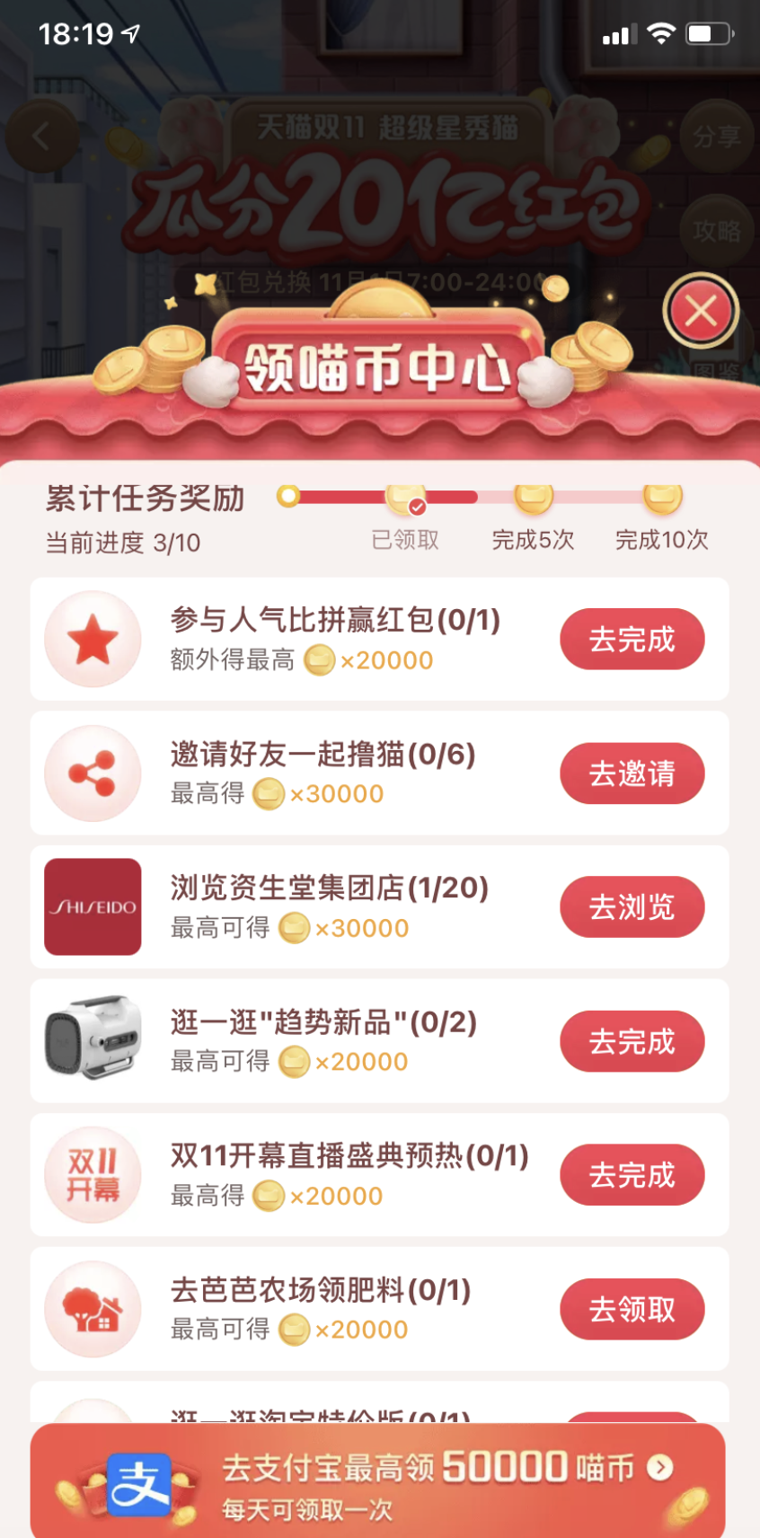 天猫官方的玩法是,10月21日开始养猫,瓜分20亿,至少300万人能领到100元以上的红包,苏宁、京东也搬出数亿元的游戏激励。但对于在红包战中浸淫多年的用户来说,利益点刺激的手法或许还不够。