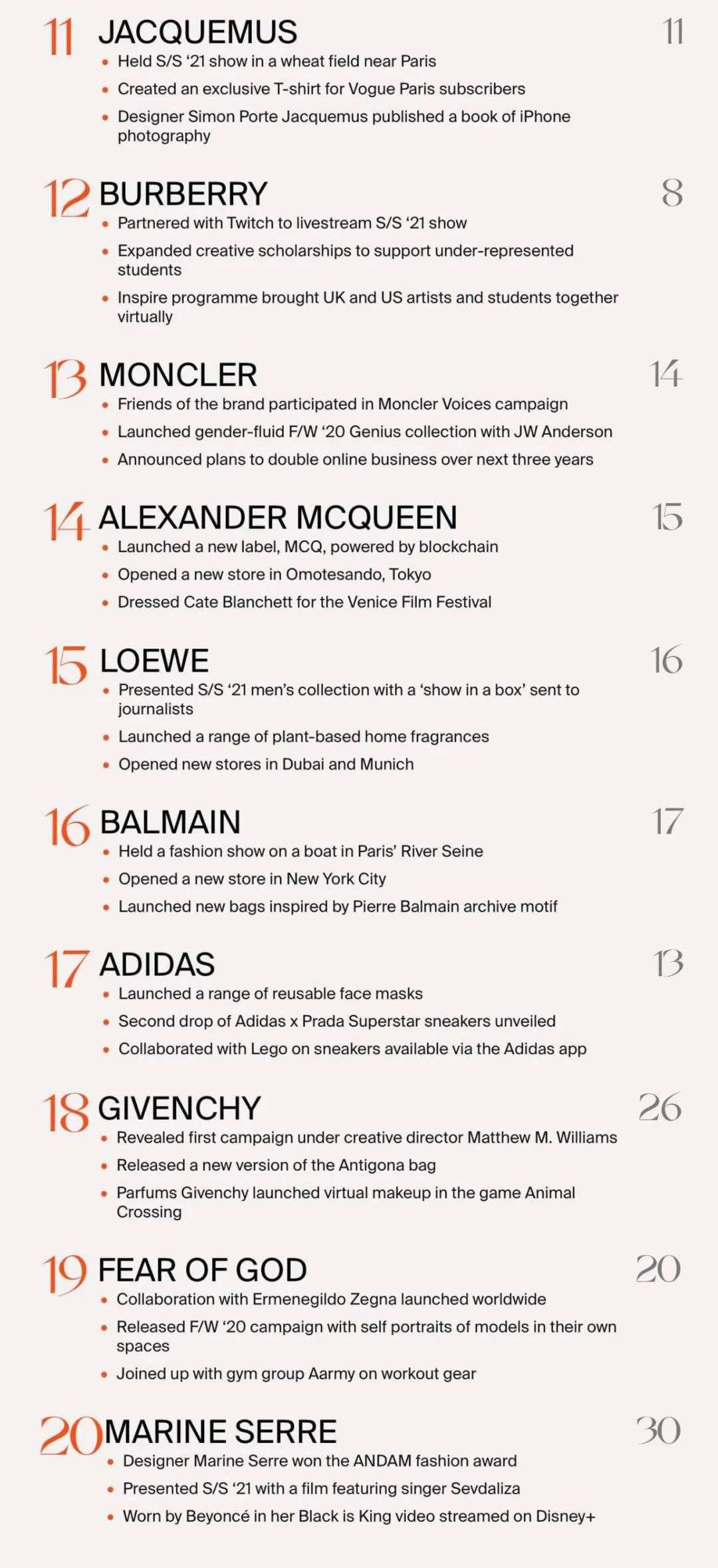 法国设计师品牌Jacquemus排名第11。该品牌是疫情爆发后最早举办小型时装秀的品牌之一。秀场设在巴黎郊外的一片麦田里,尽管参加人数有限,但在社交媒体上却收获了大量互动。在活动结束后的24小时内,该品牌的需求量激增了186%。