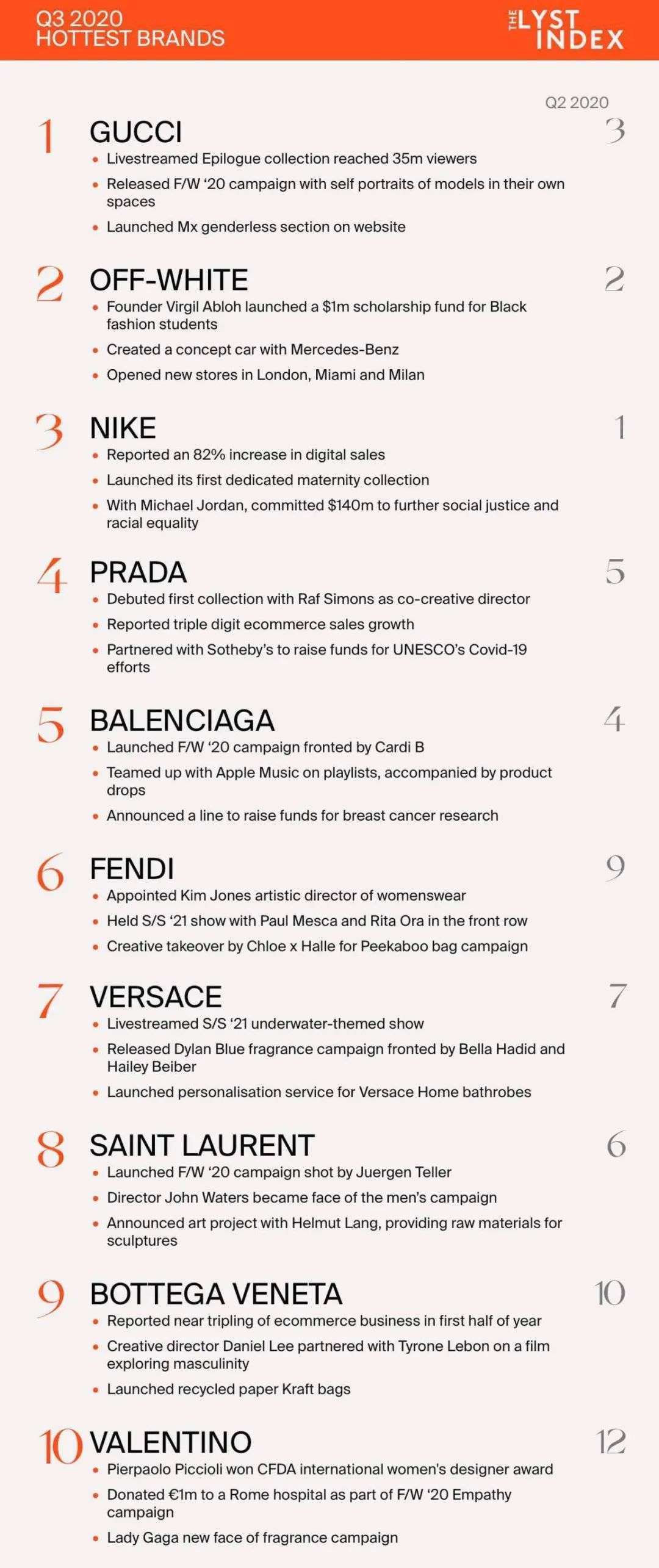 Lyst第三季度全球最热门时尚品牌中,Gucci自2019年第二季度以来首次回归榜首,较第二季度上升两名,Off-White、Nike、Prada、Balenciaga分列第二至五位。