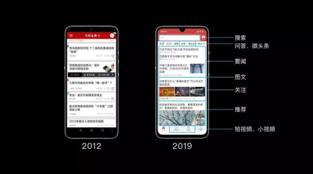 按照这个思路,头条过去八年的变化很清晰,今日头条不断引入内容分发方式,有了内容运营,推荐引擎,关注订阅和搜索引擎,另一方面,又不断拓宽内容体裁,有了图文,视频,问答,微头条,专栏,小说、直播和音频。